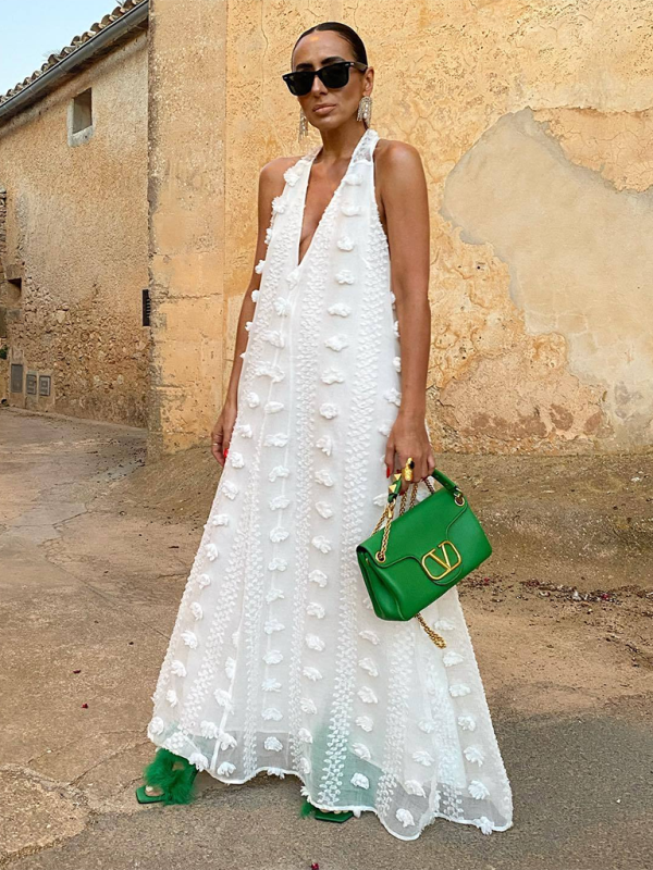 The Giselle Floral Halter Maxi Dress combines sculptural texture with graceful movement. Ideal for special occasions and destination events, this dress features layered floral accents and a flowing silhouette, creating a striking, feminine form.